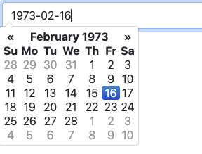 <!-- jquery --> <script src="https://cdnjs.cloudflare.com/ajax/libs/jquery/3.2.1/jquery.min.js"></script> <!-- Bootstrap 5.1.3 ---> <link href="https://cdn.jsdelivr.net/npm/bootstrap@5.1.3/dist/css/bootstrap.min.css" rel="stylesheet" crossorigin="anonymous"> <script src="https://cdn.jsdelivr.net/npm/bootstrap@5.1.3/dist/js/bootstrap.bundle.min.js" crossorigin="anonymous"></script> <!-- Datepicker --> <link rel="stylesheet" href="https://cdnjs.cloudflare.com/ajax/libs/bootstrap-datetimepicker/4.17.47/css/bootstrap-datetimepicker.min.css"/> <script src="https://cdnjs.cloudflare.com/ajax/libs/bootstrap-datetimepicker/4.17.47/js/bootstrap-datetimepicker.min.js"></script> <div class="input-group date datepicker"> <input type="text" placeholder="yyyy-mm-dd" class="form-control" name="dd" id="dd"><span class="input-group-addon"> <i class="glyphicon glyphicon-th"></i></span> </div> <script>$('.datepicker').datepicker({format:'yyyy-mm-dd'});</script>
