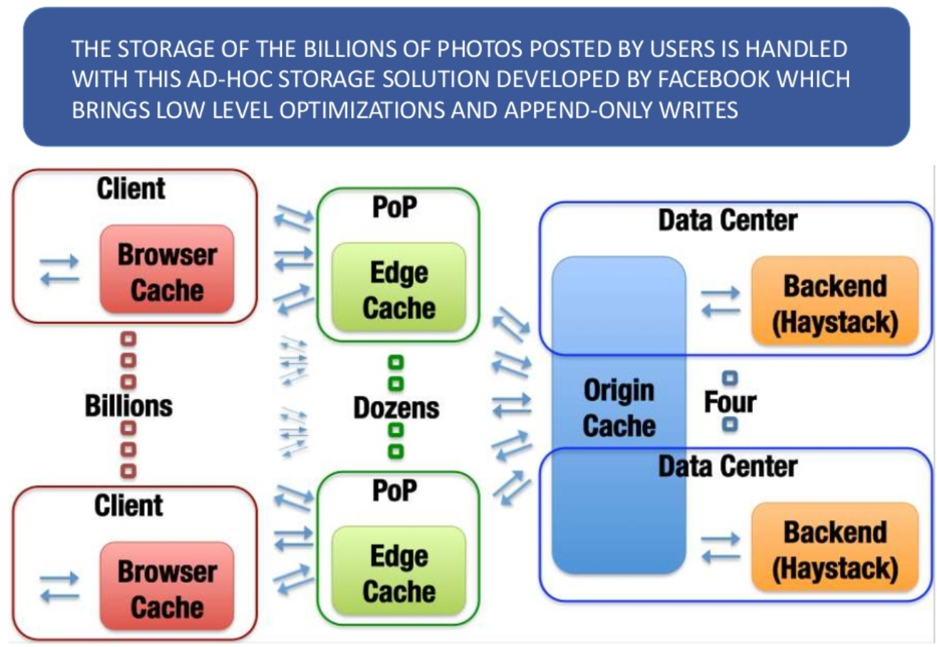Haystack is a kind of caching solution for Facebook photos posted by users that developed by Facebook which is originally designed to serve the long tail of requests seen by sharing photos in a large social network. The key feature of Haystack is to avoid disk operations when accessing meta-data.
