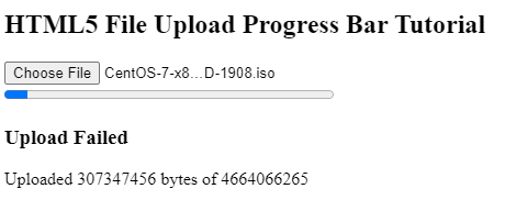 <!DOCTYPE html> <html> <head> <script> /* Script written by Adam Khoury @ DevelopPHP.com */ /* Video Tutorial: http://www.youtube.com/watch?v=EraNFJiY0Eg */ function _(el){ return document.getElementById(el); } function uploadFile(){ var file = _("file1").files[0]; // alert(file.name+" | "+file.size+" | "+file.type); var formdata = new FormData(); formdata.append("file1", file); var ajax = new XMLHttpRequest(); ajax.upload.addEventListener("progress", progressHandler, false); ajax.addEventListener("load", completeHandler, false); ajax.addEventListener("error", errorHandler, false); ajax.addEventListener("abort", abortHandler, false); ajax.open("POST", "file_upload_parser.php"); ajax.send(formdata); } function progressHandler(event){ _("loaded_n_total").innerHTML = "Uploaded "+event.loaded+" bytes of "+event.total; var percent = (event.loaded / event.total) * 100; _("progressBar").value = Math.round(percent); _("status").innerHTML = Math.round(percent)+"% uploaded... please wait"; } function completeHandler(event){ _("status").innerHTML = event.target.responseText; _("progressBar").value = 0; } function errorHandler(event){ _("status").innerHTML = "Upload Failed"; } function abortHandler(event){ _("status").innerHTML = "Upload Aborted"; } </script> </head> <body> <h2>HTML5 File Upload Progress Bar Tutorial</h2> <form id="upload_form" enctype="multipart/form-data" method="post"> <input type="file" name="file1" id="file1"><br> <input type="button" value="Upload File" onclick="uploadFile()"> <progress id="progressBar" value="0" max="100" style="width:300px;"></progress> <h3 id="status"></h3> <p id="loaded_n_total"></p> </form> </body> </html>