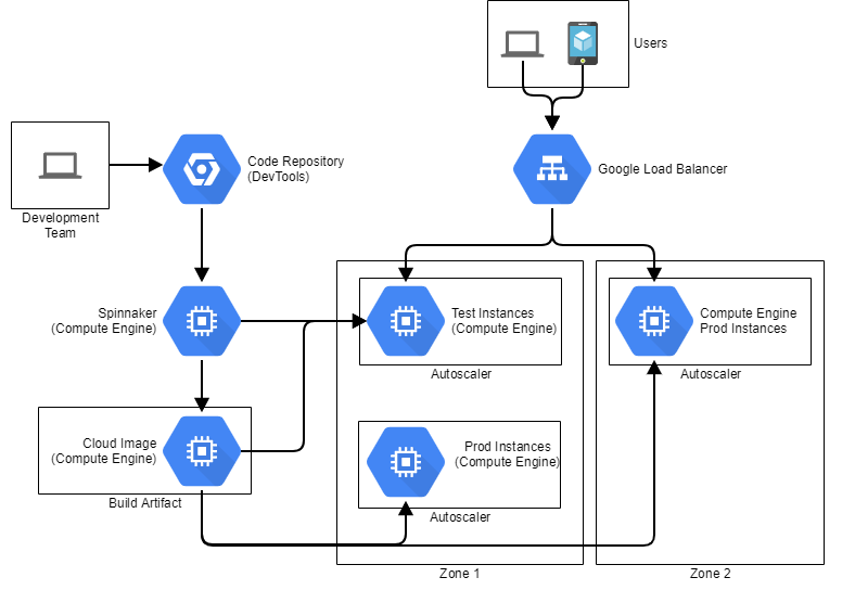 Below Architecture shows continuous delivery with Spinnaker based in GCP. For your information, Spinnaker is an open source, multi-cloud continuous delivery platform for releasing software changes with high velocity and confidence. (https://www.spinnaker.io/)