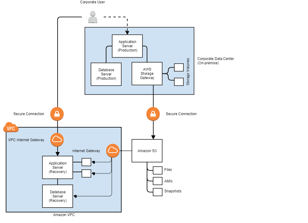 In case of disaster in the corporate data center, you can recreate the complete infrastructure from the backups on Amazon Virtual Private Cloud (Amazon VPC) that enables to provision a private, isolated section of the AWS cloud where you can recreate your application.