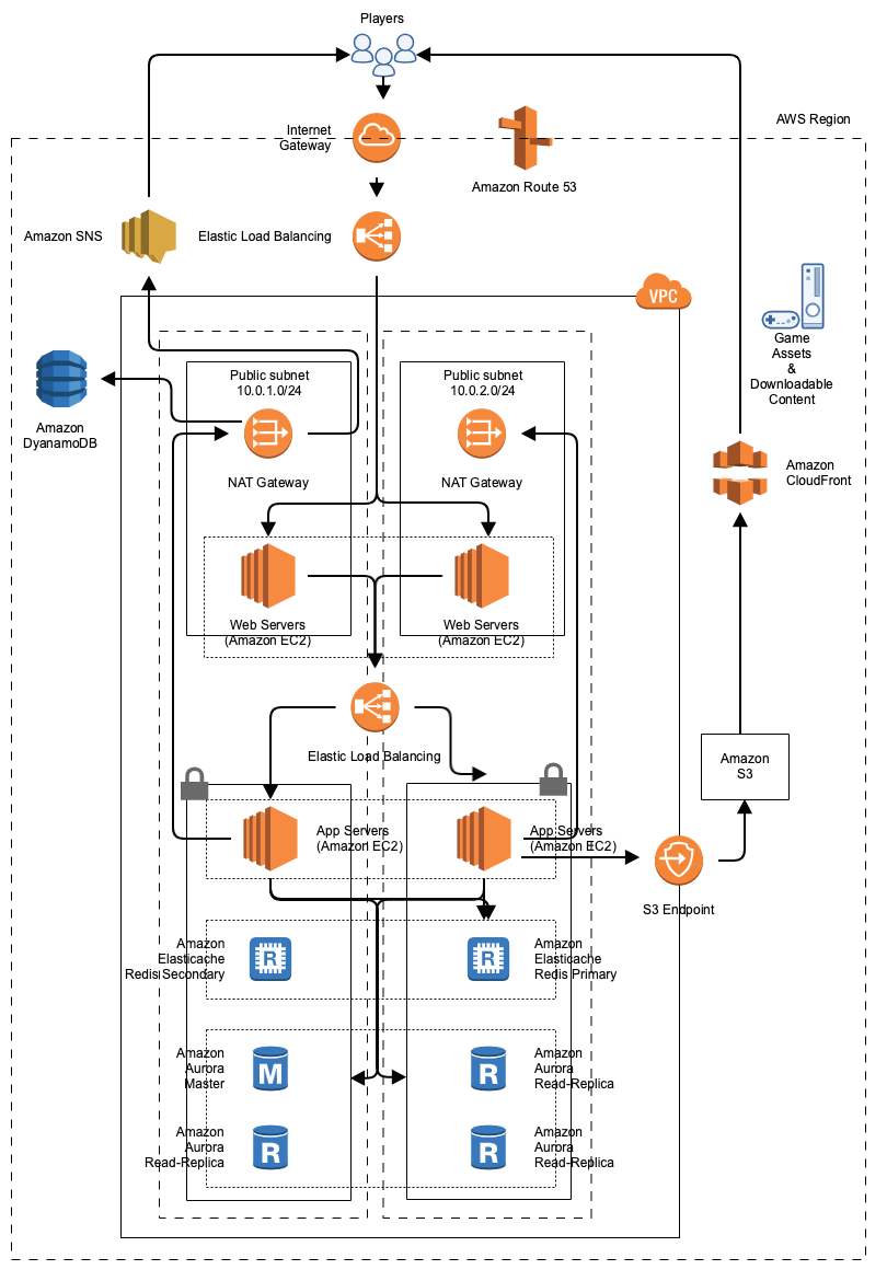The below architecture is intended for online mobile & games. These workloads are a natural fit for running on Amazon Web Services, due to unexpected traffic patterns & high demaning request rates.