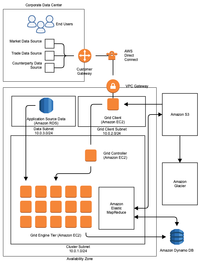 On demand provisioning of hardware, and template driven development, combined with low latency access to existing on-permise data sources make AWS a powerful platform for high performance grid computing systems.